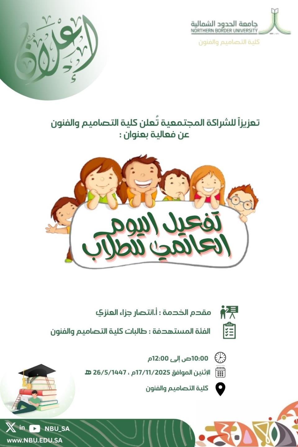 تهدف إلى تقدير دور الطلبة في المجتمع ورفع الوعي بحقوق الطلاب وتعزيز الانتماء للمؤسسات التعليمية ودور الطالب في بناء مجتمع واعي ومتعلم يسهم في تحقيق التنمية المستدامة