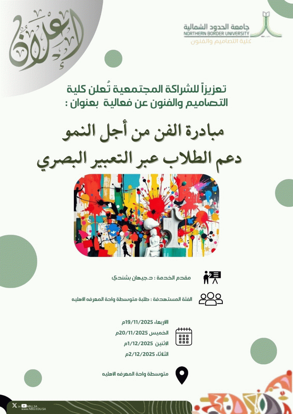 استخدام الفنون البصرية واليدوية كوسيلة للتعبير عن الذات، وتنمية المهارات الحياتية، وتعزيز الصحة النفسية، وبناء الثقة بالنفس، مما يسهم في نموهم الشخصي والاجتماعي والتعليمي.