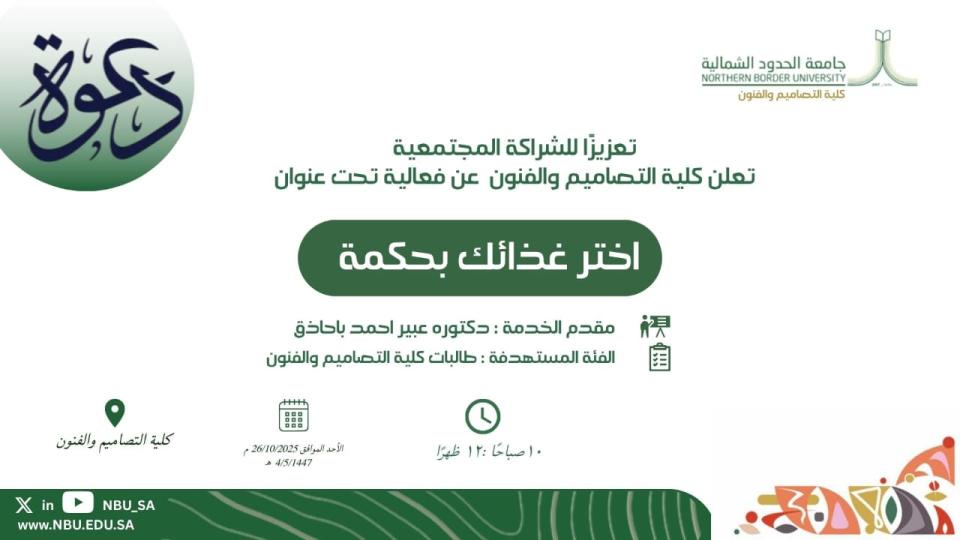 الصورة استمع Print<none>-A A +Aتاريخ أخر تعديل 05 جمادى الأول 1447التقييم PoorNot so poorمتوسطجيدVery goodحفظتاريخ البداية04 جمادى الأول 1447 10:00 ص تاريخ النهاية04 جمادى الأول 1447 12:00 م بإدارةكلية التصاميم والفنون