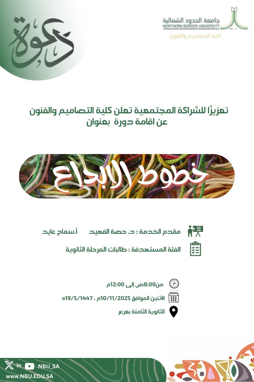 تنمية مهارات المشاركين في توظيف الخطوط لإنتاج تصاميم فنية تسهم في ابراز الجوانب الجمالية وخدمة المجتمع.