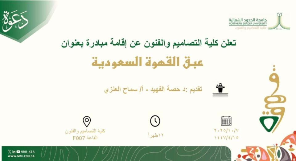 أقامت كلية التصاميم والفنون مبادره بعنوان عبق القهوة السعودية وذلك يوم الثلاثاء الموافق 7/10/2025 ، 15/4/1447 في مسرح كلية التصاميم والفنون والذي يهدف إلى تفعيل يوم القهوة العالمي، ونشر الوعي بأهمية القهوة كجزء من ثقافة الشعوب حول العالم كذلك؛ الاحتفاء بالقهوة كرمز للتواصل والضيافة، وإبراز دور القهوة في تعزيز اللحظات اليومية المميزة، ومشاركة الأجواء الإيجابية وتعزيز التفاعل المجتمعي.