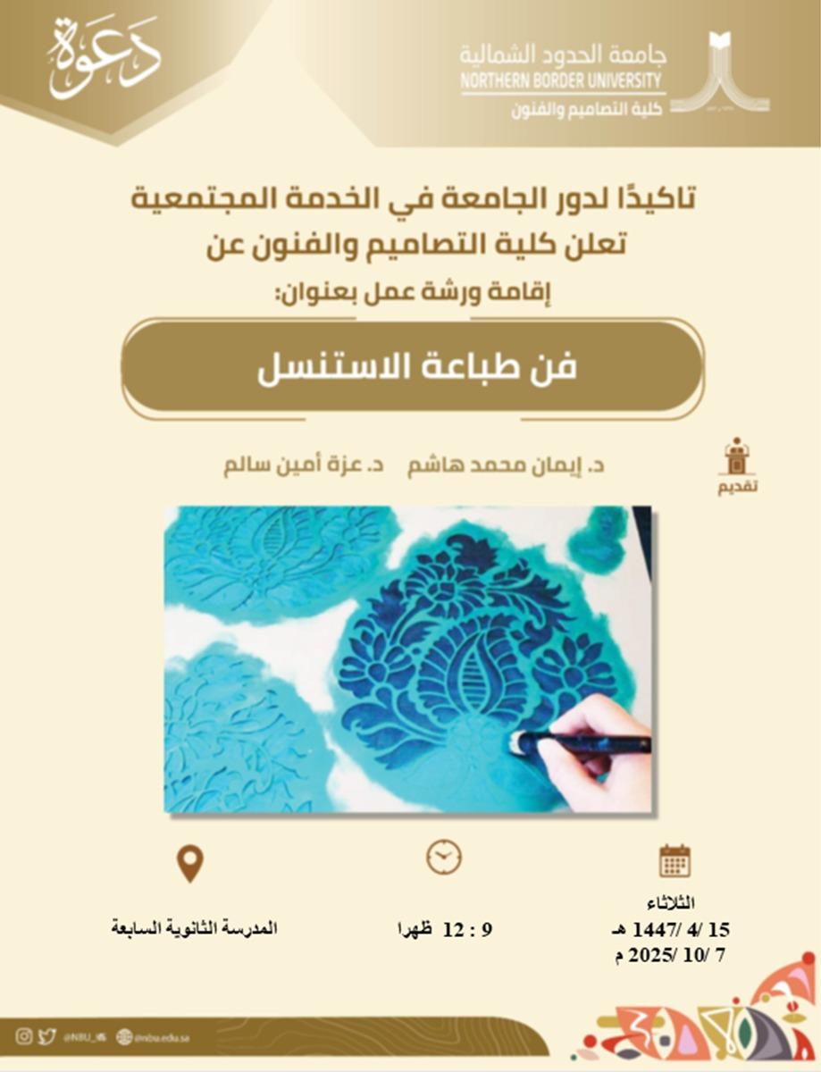 الهدف العام من الدورة هو؛ تمكين الطالبات من إنتاج قطع فنية من خلال فن طباعة الاستنسل بخامات مختلفة، وذلك من خلال تنمية مهارات الطلاب المعرفية بمفهوم طباعة الاستنسل، وتعلم كيفية تصميم الأشكال والأنماط المناسبة للطباعة باستخدام الاستنسل، وإتقان خطوات تطبيق الاستنسل على القماش.