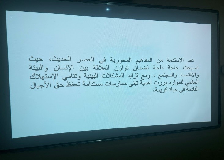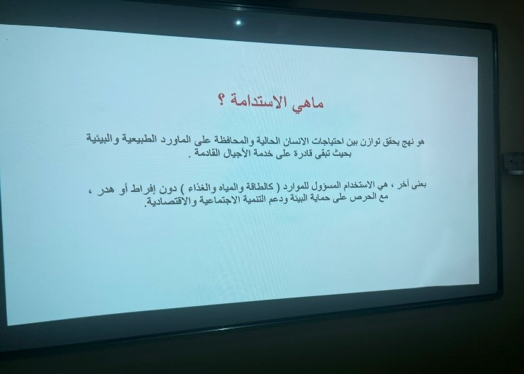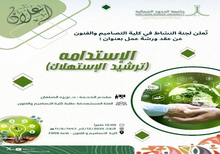 الصورة الهدف العام :الوعي بمفهوم الاستدامة وترشيد الاستهلاك والاستفادة منها. استمع Print<none>-A A +Aتاريخ أخر تعديل 13 جمادى الآخر 1447التقييم PoorNot so poorمتوسطجيدVery goodحفظتاريخ البداية11 جمادى الآخر 1447 12:00 م تاريخ النهاية11 جمادى الآخر 1447 1:00 م الموقعكلية التصاميم والفنونبإدارةكلية التصاميم والفنون